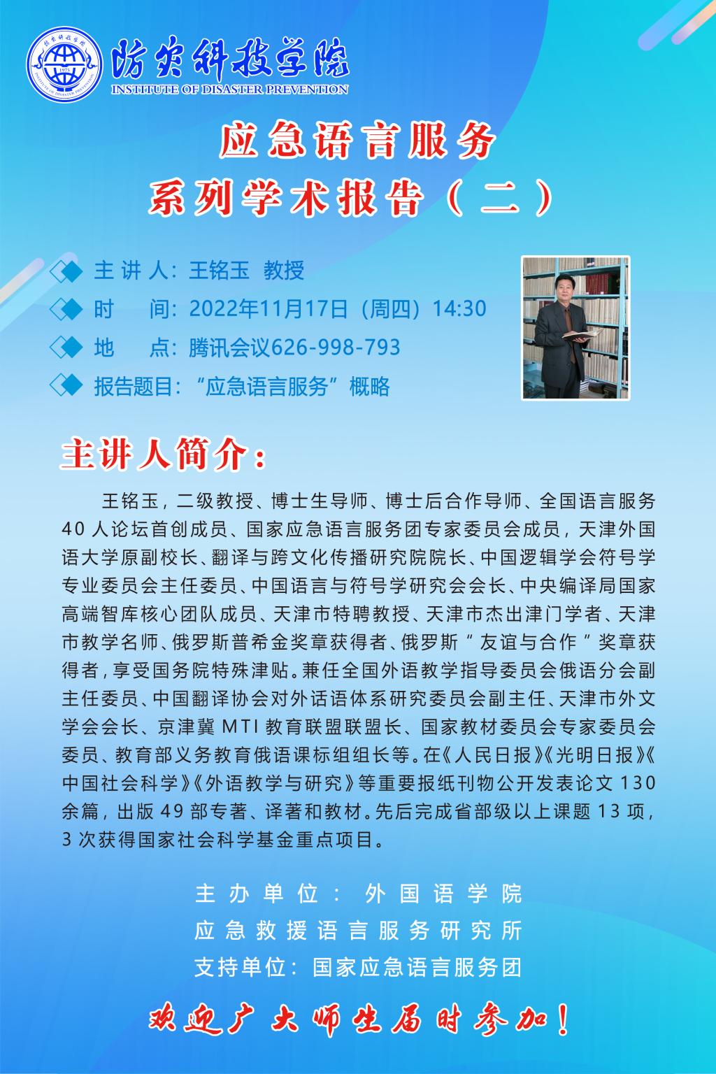 为提高贝博官网师生应急语言服务专业及学术水平,贝博官网将于2022年11月17日下午14:30邀请国家应急语言服务团专家王铭玉教授做题为“‘应急语言服务’概略”的学术报告。欢迎广大师生参加,详情见海报。