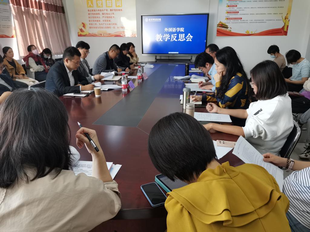 会上,池丽霞院长首先就学院、教研室及教师等层面的反思情况进行了汇报。池丽霞围绕“思所得、思不足、思提升”,凝练了学院教学工作的有益经验、反思了存在的问题并提出了改进措施。党总支书记王建富就抓教风学风建设方面如何发挥党组织的带动作用进行了反思,提出进一步完善导师制和党员联系新生宿舍制度,形成协同育人、全方位育人的局面,切实改善学生学习目标不明确,学习动力不足等问题。石峰就英语专业课程、大学英语课程、学风建设、学生评价机制等方面和专业英语教研室主任、公共外语教研室主任及与会教师进行了互动交流和探讨。教务处副处长谢力就《关于加强教风和学风建设的若干意见》进行了深度解读。