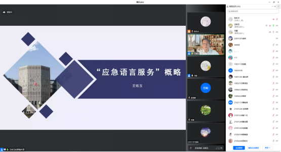 王教授对于国家应急语言服务理论研究和应用研究各方面的工作有全面和深入的思考。讲座中,王教授首先从应急语言服务的理念“平时备急、急时不急”入手,对国家应急语言服务的概念、服务对象、服务类型进行了介绍,并阐述了国家应急语言服务能力的现状、服务能力建设的五大目标、七大内容、应急语言服务教育体系的构建等方面进行了全面介绍。王教授启发参会师生从应急语言服务教育体系建设的理论体系、人才培养、课程教材、教育管理、教师培养、教育科研以及教育保障等体系建设方面发挥聪明才智,选定研究方向,不断深入挖掘,做出自己的成绩。