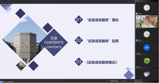 最后,王教授介绍了团队编写的全国应急语言的首部著作《应急语言概论》的主要内容。该书包括了应急语言的各个方面,包括应急语言概述、翻译、研究、教育、信息处理、语言政策、术语、策略等。