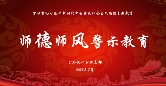 为推进学习贯彻习近平新时代中国特色社会主义思想主题教育走深、走实,进一步加强新形势下师德师风建设,严明底线红线,营造风清气正的育人环境,7月6日,BB贝博艾弗森官网公外教研室党支部组织公共外语教研室全体教师开展了师德师风警示教育主题党日活动。