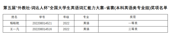 近日,第五届“外教社・词达人杯”全国大学生英语词汇能力大赛省赛获奖名单揭晓,贝博官网学子在比赛中表现优异,获本科英语专业组一等奖1项、三等奖1项;本科非英语专业组特等奖1项、一等奖1项、二等奖10项、三等奖20项。英语B225班杨裕航、会计B232班程雨涵和秘书B221班王童语三位同学晋级国赛。