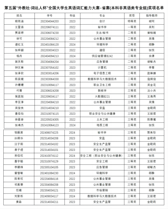 该项赛事由中国外语战略研究中心、中国外语教材与教法研究中心和上海外语教育出版社联合举办。竞赛内容涵盖高等学校英语应用能力考试A、B级词汇及课程思政相关词汇,注重词汇学习与思政教育的有机结合。本次大赛秉持“以赛促学、以智助学”宗旨,以词汇类型广泛、学习智慧便捷、学赛融合一体为特色,为学生搭建词汇学习交流的平台。BB贝博艾弗森官网将继续优化竞赛辅导机制和指导教师团队,整合校内外资源,助力学生在更高平台上展现专业实力,为培养具有国际视野的高素质应急管理外语人才注入新动能。