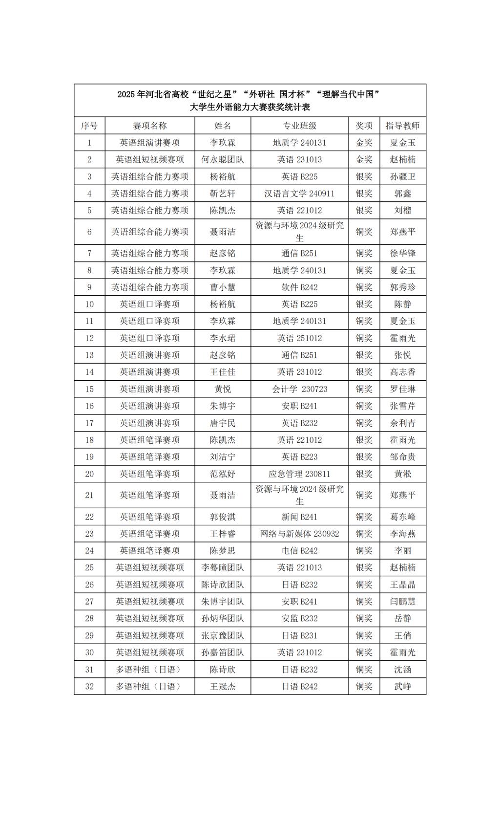 近日,2025年河北省高等学校“世纪之星”“外研社·国才杯”“理解当代中国”全国大学生外语能力大赛河北赛区系列赛事的决赛落下帷幕。贝博官网学子表现亮眼,共斩获省级金奖2项、银奖10项、铜奖20项,其中地球科学与工程学院的李玖霖、BB贝博艾弗森官网的何永聪团队分别摘得英语演讲、英语短视频赛项金奖,成功晋级国赛。