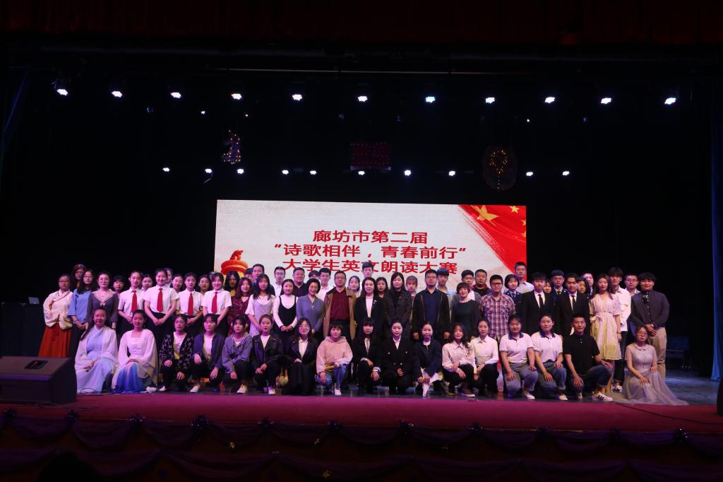 廊坊市第二届“诗歌相伴·青春前行”英文朗读大赛于4月27日在华航礼堂圆满落幕。本次大赛由共青团廊坊市委、廊坊市学生联合会主办,北华航天工业学院团委、北华航天工业学院BB贝博艾弗森官网共同承办,旨在纪念五四运动一百周年,全面提高大学生英语综合运用能力。来自北华航天工业学院等12所廊坊域内院校的七十余名选手精心准备了48组朗读作品及表演作品,呈现出了一场视听盛宴,代表了廊坊地区英语教学水平,展示了当代大学生的青春朝气。贝博官网BB贝博艾弗森官网2016级和2018级共五位同学代表贝博官网参加了此次朗读比赛。