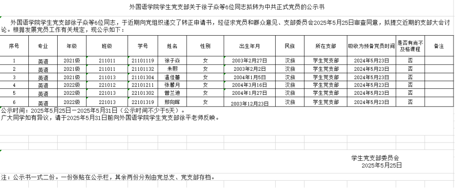 BB贝博艾弗森官网学生党支部关于徐子焱等6位同志拟转为中共正式党员的公示书